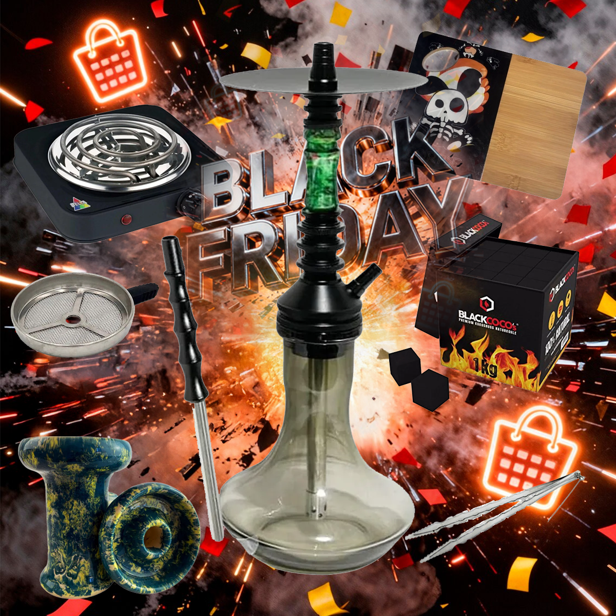 Este pack reúne todos los accesorios esenciales para que no tengas que preocuparte por nada: carbón natural Black Cocos, cazoleta Mud Bowl, hornillo de 1000W, pinzas, rejilla y la Tabla de Mezclas Corpse, perfecta para preparar tus cazoletas con comodidad y estilo.